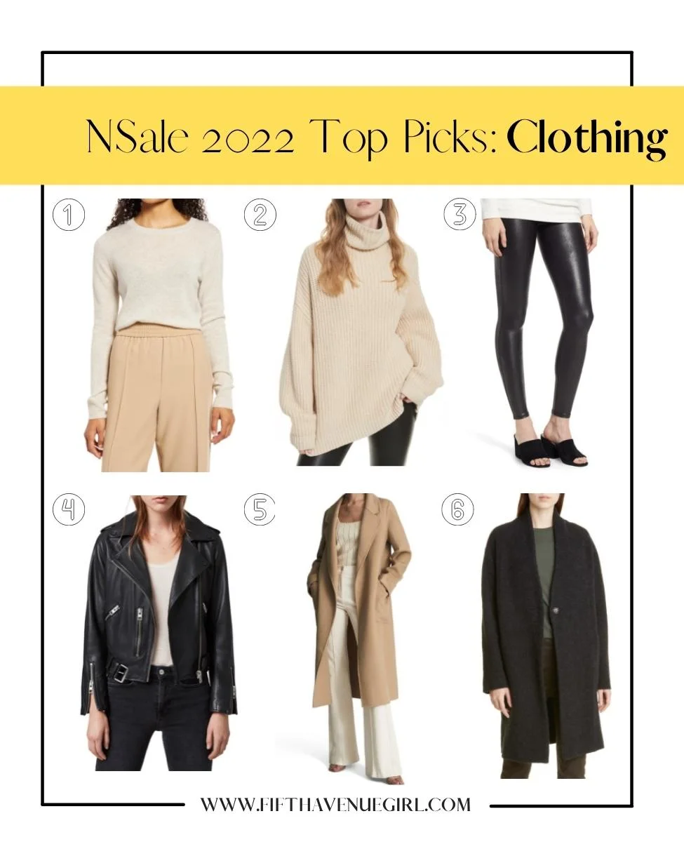 1. Nordstrom Cashmere Crewneck Sweater ($89.90, originally $129). 2. Free People Swim Too Deep Turtleneck Sweater ($79.99, originally $128). 3. Spanx Faux Leather Leggings ($64.90, originally $98). 4. AllSaints Balfern Leather Biker Jacket ($329.99-$369.99, originally $529-$569). 5. Reiss Elise Wool Blend Longline Coat ($394.99, originally $590). 6. Vince Cardigan Coat ($354.99, originally $545).